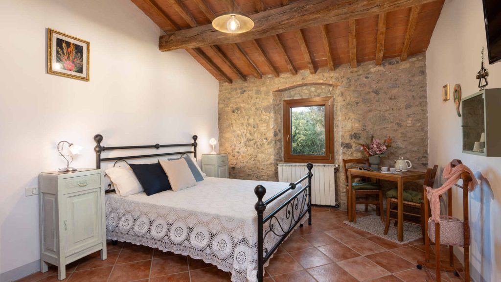 Im ersten Stock des Bauernhauses befinden sich zwei Zimmer, beide mit eigenem Bad, Klimaanlage und unabhängiger Heizung – ein Doppelzimmer mit Kamin und Terrasse und ein Doppelzimmer.Die Wohnungen